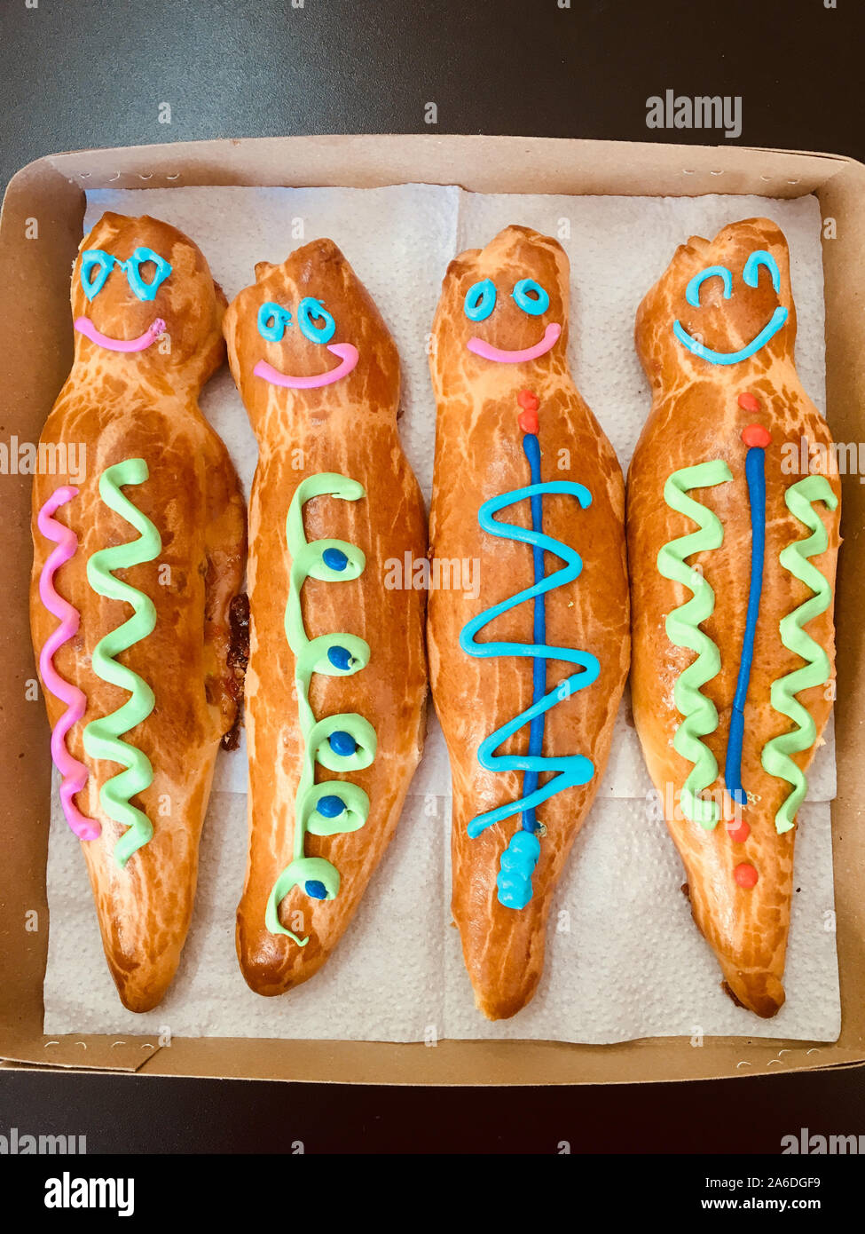 Guagua De Pan Bread Boy In Spanish Language Group Of Breads Decorated With Colored Lines Inside A Cardboard Box Stock Photo Alamy